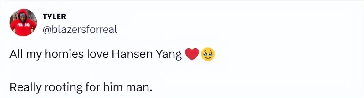 开拓者球迷Tyler也写道:“我所有兄弟都爱杨瀚森,都在为他加油!”