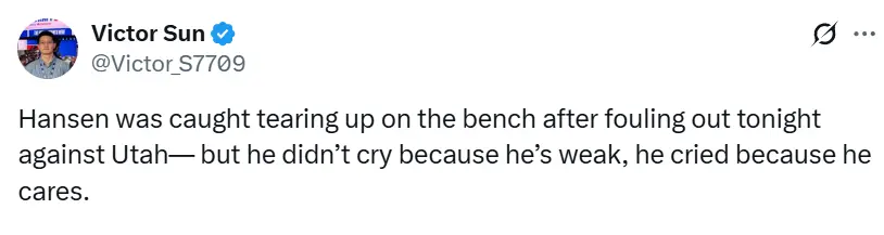 腾讯前方记者Victor Sun在社媒上发出了瀚森落泪的一幕,配文写道:“瀚森犯满离场后,坐在板凳席上哭了——但他哭不是因为他软弱,而是因为他在乎。”