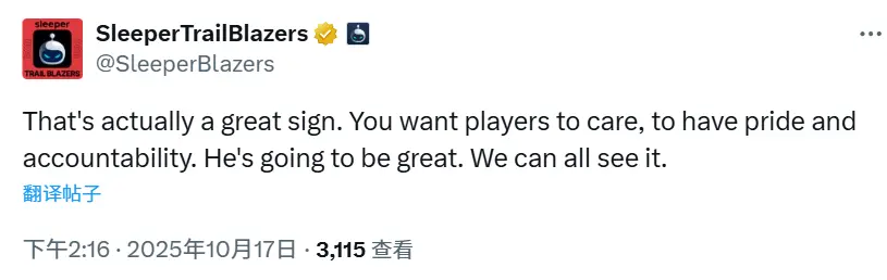 开拓者球迷账号SleeperTrailBlazers写道:“这其实是个非常好的信号。你总希望球员们能投入真心、有荣誉感、敢承担责任。他一定会变得很出色创元网,我们所有人都看得出来。”